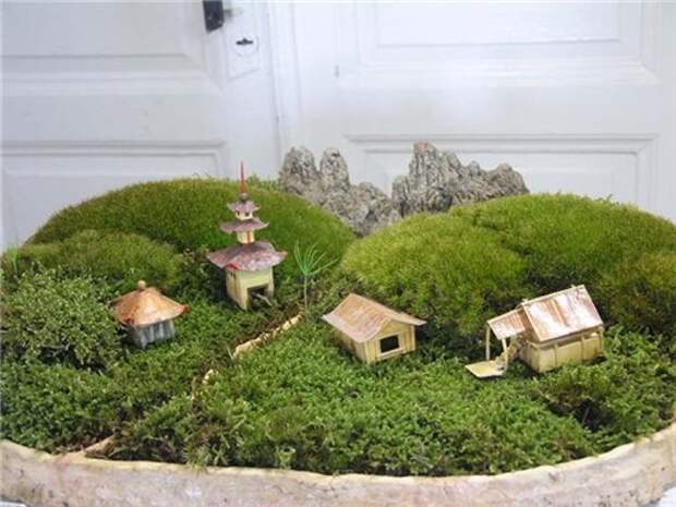 Мох — неизменный атрибут японского сада, он дополняет и оттеняет собой растения и камни. Можно создать миниатюрный садик, дополнив его старым пнем или живописной корягой.
