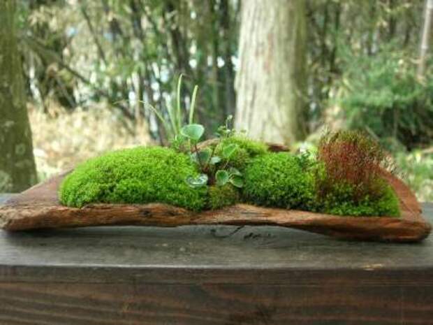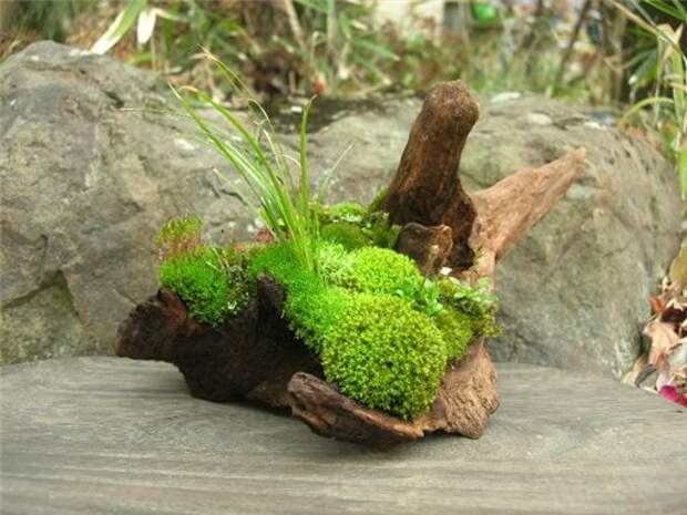 Камни, коряги или пень также можно зарастить мхом. Из коряг, можно сделать красивые композиции, дополнив их другими растениями.