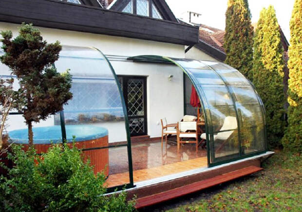 Другой вариант летней пристройки выглядит более современно. Она легко трансформируется из закрытой в открытую веранду на свежем воздухе.