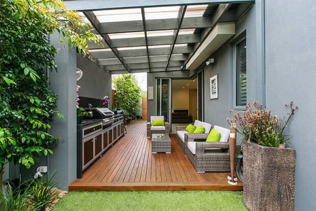Идеальный дизайн веранды в частном доме. Здесь вам и летняя кухня, и столовая, и зона отдыха.